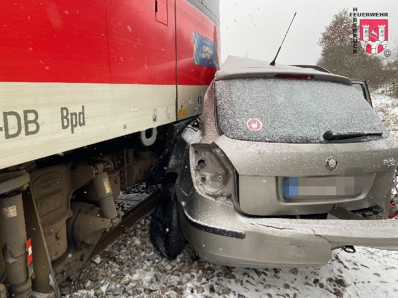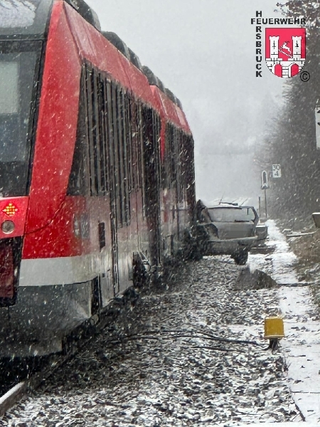 Aufgrund der eisigen Witterungsbedingungen war ein Pkw am Bahnübergang der Kreisstraße von Hersbruck nach Hohenstadt ins Rutschen gekommen und hatte sich im Gleisbett am Bahnübergang festgefahren. Ein herannahender Zug erfasst dann kurze Zeit später den stehenden Pkw und schleifte dieses mit. Eine Person befand sich zu diesem Zeitpunkt nicht mehr im Pkw.