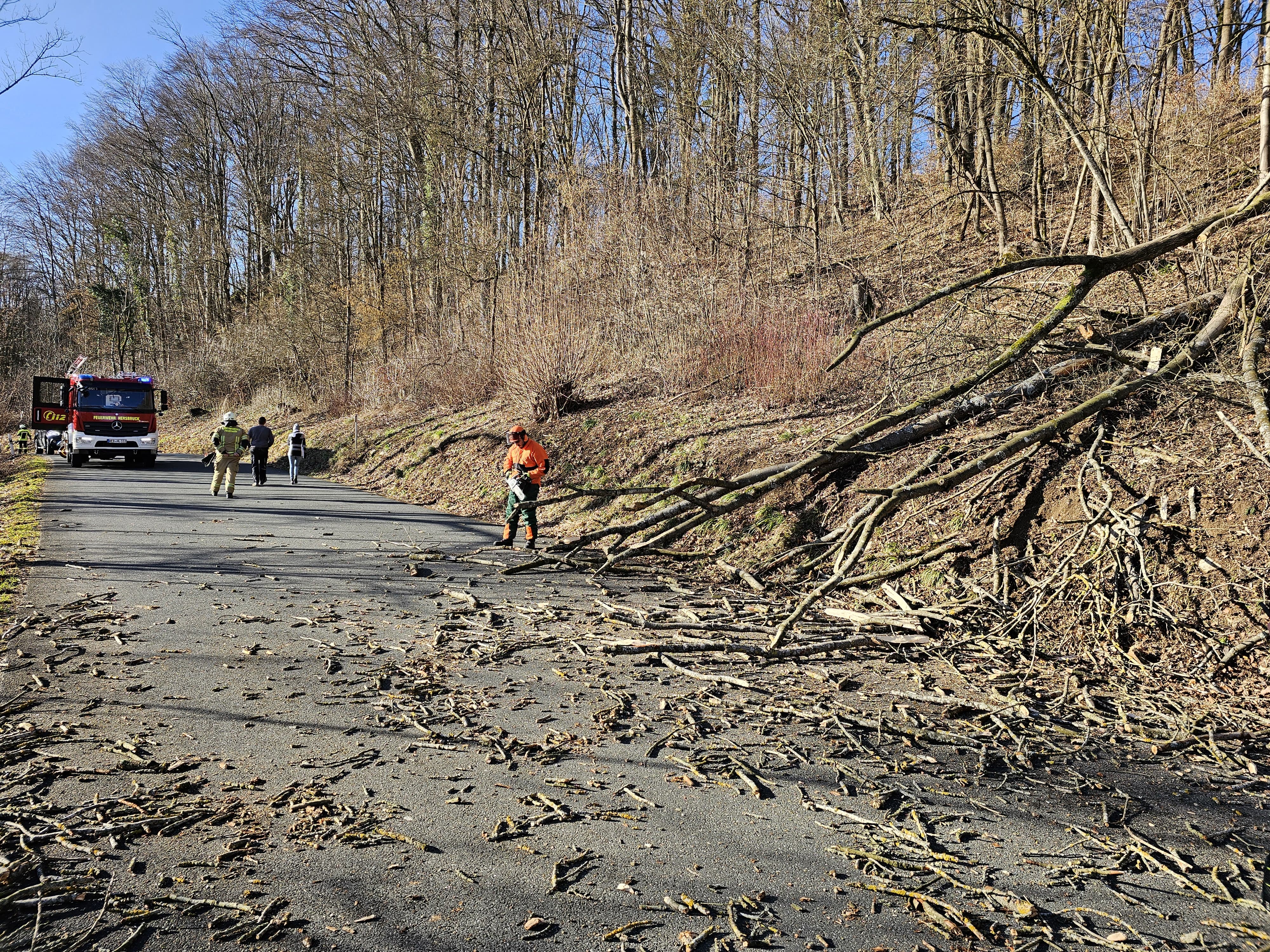 Auf der Verbindungsstraße zwischen Hersbruck und Großviehberg blockierte ein umgefallener Baum die Fahrbahn. In Zusammenarbeit mit den Kameradinnen und Kameraden aus unserer Ortsteilwehr beseitigten wir den Baum und reinigten die Straße.