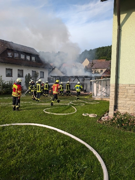 Entgegen der Meldung brannte kein Dachstuhl, sondern ein Geräteschuppen in voller Ausdehnung. Bereits auf der Anfahrt war eine starke Rauchentwicklung sichtbar. Am Einsatzort unterstützten wir mit Atemschutzgeräteträger und Wärmebildkamera bei den Nachlöscharbeiten. Die Kräfte aus Hersbruck konnten zügig aus dem Einsatz herausgelöst werden.