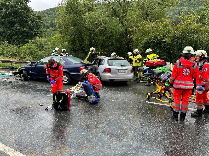 Vor Ort konnte schnell festgestellt werden, dass eine verletzte Person lediglich eingeschlossen und nicht eingeklemmt im Fahrzeug war. Der Fahrer des anderen Unfallfahrzeugs wurde durch Ersthelfer bereits schwerverletzt aus dem Fahrzeug befreit.