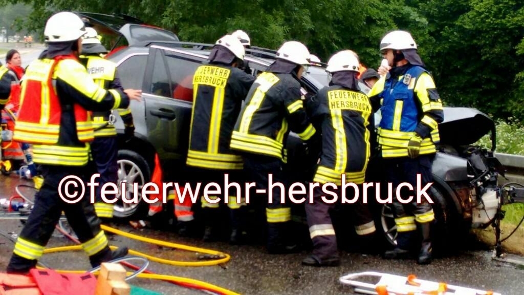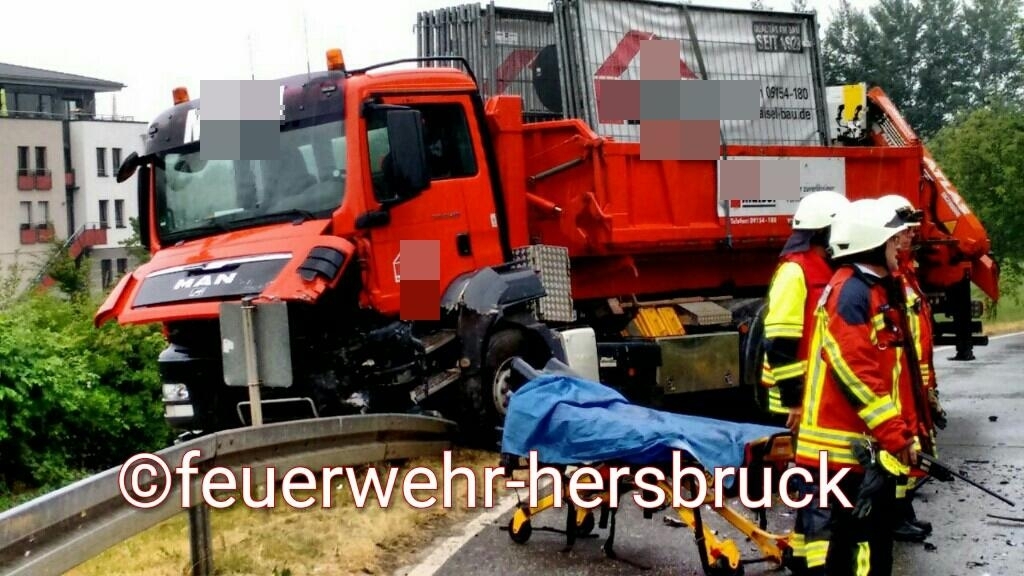 Verkehrsunfall zwischen LKW und PKW, zwei Personen eingeklemmt.