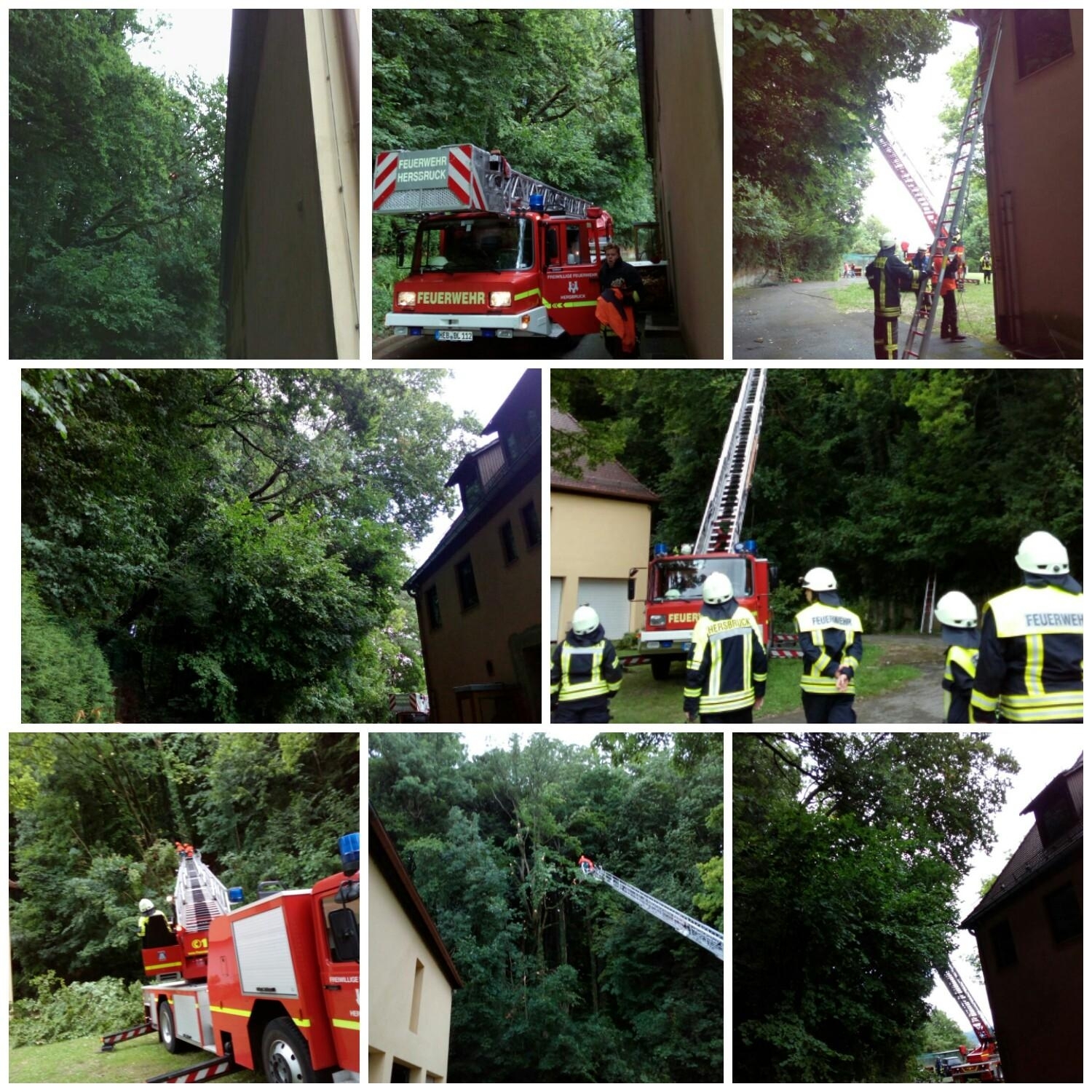 Am Böcklerheim im Gebhardtweg war ein Baum nach einem Windstoß ab der Wurzel gesplittert, schief am Hand gehangen und drohte aufs Haus und eine Telefonleitung zu stürzen. Durch die Drehleiter wurde die Krone und die hängenden Äste auf 15 Meter gestutzt und anschließend der Stamm mit der Seilwinde des Rüstwagen zu Boden gezogen. Eine normale Fällung wäre aufgrund der Splitterung nicht gefahrlos möglich gewesen.